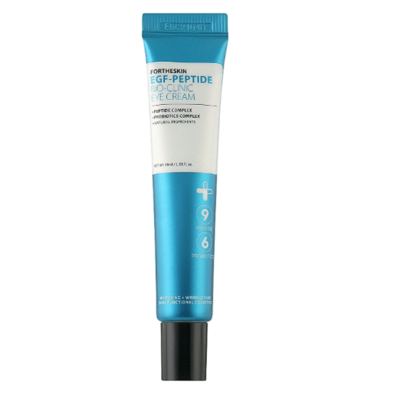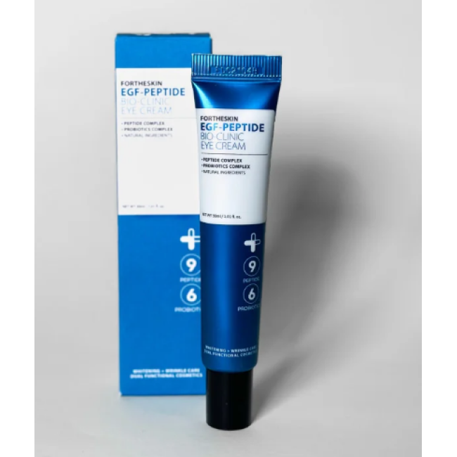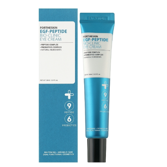 Крем для повік EGF-Peptide Bio-Clinic Eye Cream - здатний зволожити, підтягнути і зміцнити шкіру навколо очей. Цей засіб освітлює темні кола, захищає й укріплює шкірний бар'єр і контролює баланс вологи і себуму. В складі є пантенол, який володіє потужними зволожувальними властивостями, допомагає утримувати вологу, бореться зі зморшками і заспокоює чутливу, схильну до подразнень шкіру. Ніацинамід - вирівнює тон шкіри і зменшує пігментацію, бореться зі зморшками, регулює вироблення себуму і стимулює синтез керамідів. Пробіотики - зміцнюють природні захисні функції шкіри, прискорюють загоєння пошкоджень, а також нормалізують функціонування шкіри. Пептиди- проявляють виражений ліфтинг-ефект, розгладжують "гусячі лапки", зменшують набряки та мішки під очима. Засіб від Fortheskin зміцнює шкіру і надійний помічник у боротьбі з віковими змінами.