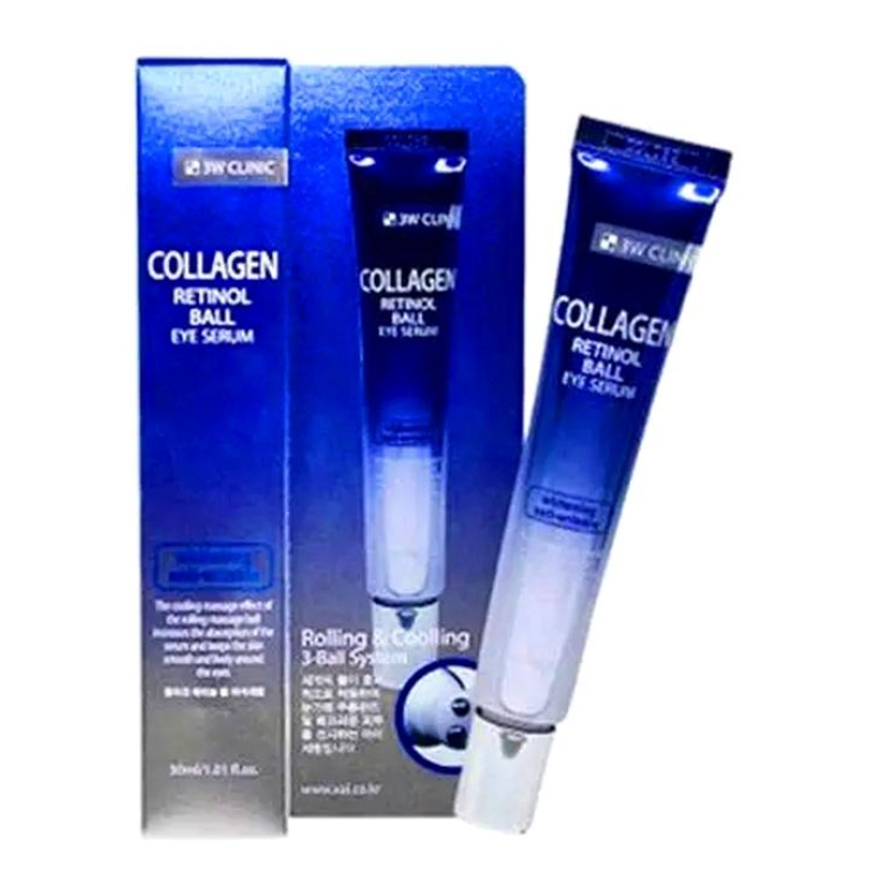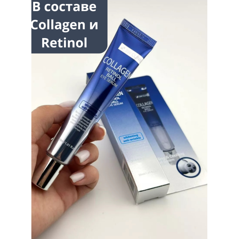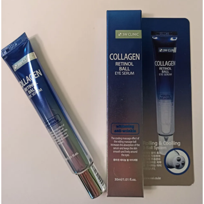 Крем Collagen Retinol Eye Ball Serum - інноваційний засіб, створений для делікатного догляду за чутливою шкірою навколо очей. В складі є колаген - підвищує пружність, розгладжує зморшки та відновлює бар'єрні функції шкіри. Ретинол - покращує текстуру та тон шкіри, стимулює оновлення клітин, бореться з пігментними плямами та спричиняє збереження вологи. Ніацинамід - освітлює шкіру, звужує пори, стимулює синтез колагену та зменшує втрату вологи. Крем має заспокійливу та зволожувальну дію. Аденозин - активно проявляє себе в боротьбі зі зморшками, стимулює метаболізм клітин і підтягує шкіру. Крем має особливість, три кулькові масажери на кінчику флакона, які забезпечують приємний масажний ефект, знімають втому, покращують мікроциркуляцію крові та сприяють кращому поглинанню інгредієнтів. Засіб від 3W Cliniс ефективно зволожує, освітлює, живить та розгладжує шкіру.