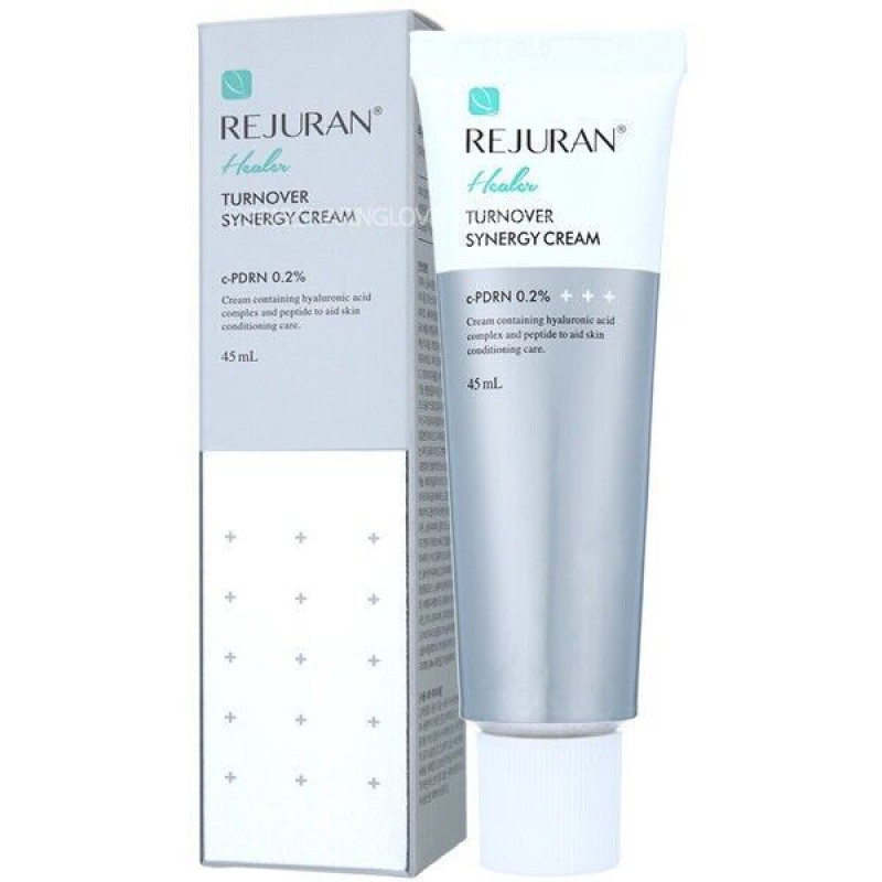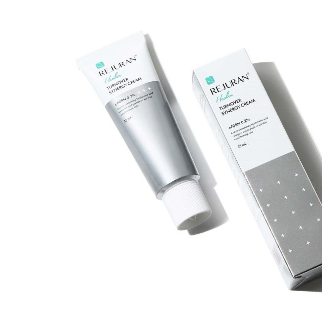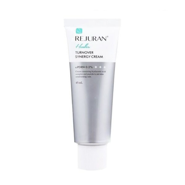 Rejuran Healer Turnover Synergy Cream – ультралегкий крем, який забезпечує інтенсивне зволоження та захист для всіх типів шкіри. Цей крем поєднує в собі розроблену формулу, що дарує вашій шкірі гладкість, пружність і природний баланс вологи. Його легка текстура швидко вбирається, створюючи невидимий захисний шар, який запобігає втраті вологи та допомагає відновлювати шкірний бар'єр. 8 видів гіалуронової кислоти підтримують оптимальний рівень зволоженості, шкіра стає пружною та м'якою. Полінуклеотид c-PDRN 0,2% активізує вироблення колагену та еластину, допомагаючи зберегти молодість шкіри. Екстракт кореня анемаррени - має потужні антиоксидантні властивості, знімає запалення, зменшує почервоніння та заспокоює чутливу шкіру. Пальмітойл трипептид- стимулює вироблення колагену, підвищуючи щільність шкіри. Ацетил дипептид-1 цетиловий ефір - допомагає знижувати чутливість шкіри до зовнішніх подразників, надає відчуття комфорту, заспокоює подразнення та зміцнює бар’єрні функції шкіри.