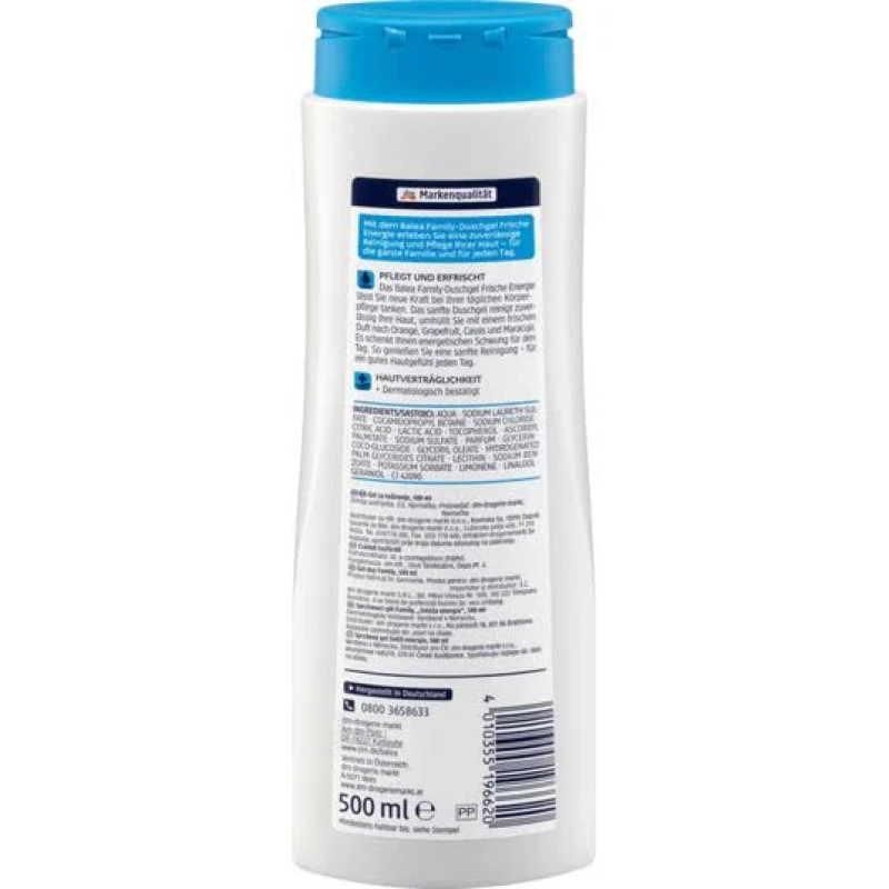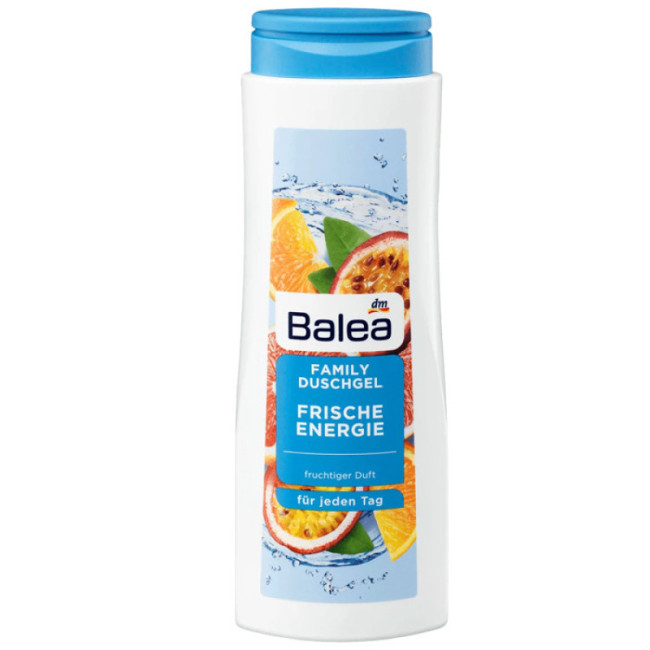 Гель для душу Balea Frische Energie - засіб допомагає підтримати природний баланс зволоження шкіри. В складі є насичений аромат з нотками апельсина, грейпфрута, маракуя і чорної смородини, які наповнюють енергією і піднімають настрій. Молочні протеїни - живить шкіру амінокислотами, які сприяють відновленню колагену і еластину. Молочна кислота - це інгредієнт, який ніжно доглядає шкіру, заспокоїть подразнення і допомагає підтримати її гладкість. Гель для душу ефективно очищає шкіру від забруднень та надлишків себуму, не порушує природний рH шкіри. Засіб від Balea має свіжий фруктовий аромат, який дарує відчуття свіжості та комфорту.