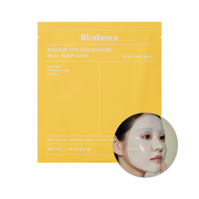 Маска Radiant Vita Niacinamide Real Deep Mask 1sheet - поєднує ефективність активних компонентів і доглядовий ефект. В складі є ніацинамід покращує текстуру, вирівнює тон та розгладжує рельєф. Ананасова вода м'яко відлущує відмерлі клітини, повертаючи свіжість та сяйво. Основа маски стимулює обмінні процеси та створює потужний антиоксидантний захист. Засіб коригує видимість пігментації, постакне та слідів від висипань. Маска легко прилягає до обличчя та не сповзає, надаючи шкірі пружності, еластичності та рівномірного тону. Засіб від Biodance дарує здорове сяйво та відчуття свіжості, запобігає від негативного впливу навколишнього середовища і запобігає появі тьмяності та сухості.
