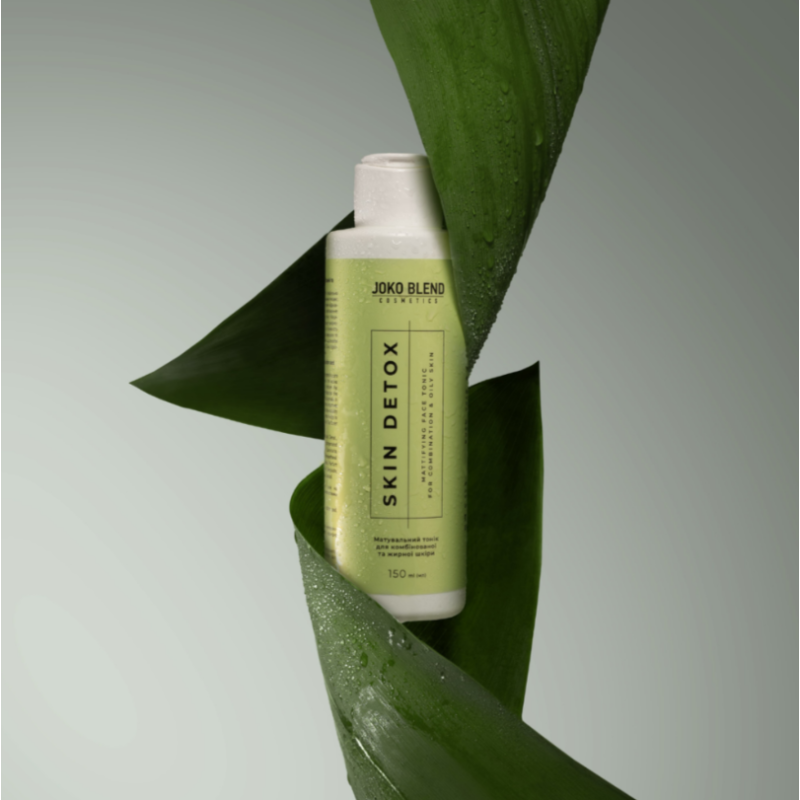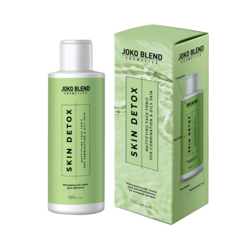 Тонік Skin Detox створений спеціально для комплексного догляду за комбінованою та жирною шкірою. Тонік завершує очищення, видаляючи залишки забруднень та засобів для вмивання, відновлює оптимальний рН-баланс та готує шкіру для подальшого догляду. В складі є ніацинамід - регулює себум, підвищує пружність та еластичність шкіри, зменшує почервоніння, запалення та видимість дрібних зморшків, звужує пори. Екстракт ламінарії - тонізує, стимулює обмінні процеси, зволожує та підтримує пружність шкіри. Алантоїн - пом'якшує, заспокоює та сприяє регенерації тканин. Пантенол - утримує вологу, зменшує подразнення та підтримує здоровий стан шкіри. Тонік регулює вироблення шкірного сала, запобігає появі жирного блиску, звужує пори, вирівнює тон та мікрорельєф епідермісу. Засіб делікатно видаляє залишки забруднень та очищувальних засобів. Він відновлює оптимальний pH-баланс шкіри. Засіб від Joko Blend слугує профілактикою недосконалостей та дарує тривале відчуття свіжості та комфорту.