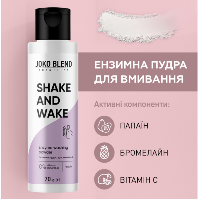 Екзимна пудра делікатний засіб для щоденного очищення шкіри, який ефективно усуває забруднення, не порушуючи природний баланс. Засіб не пересушує шкіру, не викликає подразнень, появи прищів та комедонів. Засіб не стягує, м'яко очищує пори, зменшує чорні цятки та контролює надлишок себуму. В складі є папаїн - ефективний ензим - ексфоліант, що видаляє надлишки себуму та забруднення з пор, стимулює регенерацію, має протизапальні та зволожувальні властивості. Бромелайн- фермент ананаса, який м'яко відлущує відмерлі клітини та очищує пори. Кукурудзяний крохмаль- легко очищує шкіру, допомагає боротися з постакне та пігментацією. Вітамін С - природний антиоксидант, освітлює шкіру, надає сяйва та підсушує запальні елементи. Засіб від Joko Blend глибоко та делікатно очищує шкіру, вирівнює тон, рельєф, надає матовий ефект та природне сяйво.