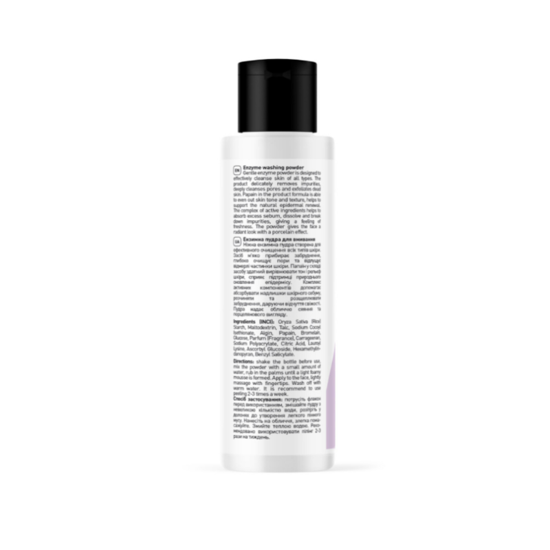 Нанесення: потрусіть флакон перед використанням, змішайте пудру з невеликою кількістю води, розітріть у долонях до утворення легкого пінного мусу. Нанесіть на обличчя, злегка помасажуйте. Змийте теплою водою. Рекомендовано використовувати пілінг 2-3 рази на тиждень.