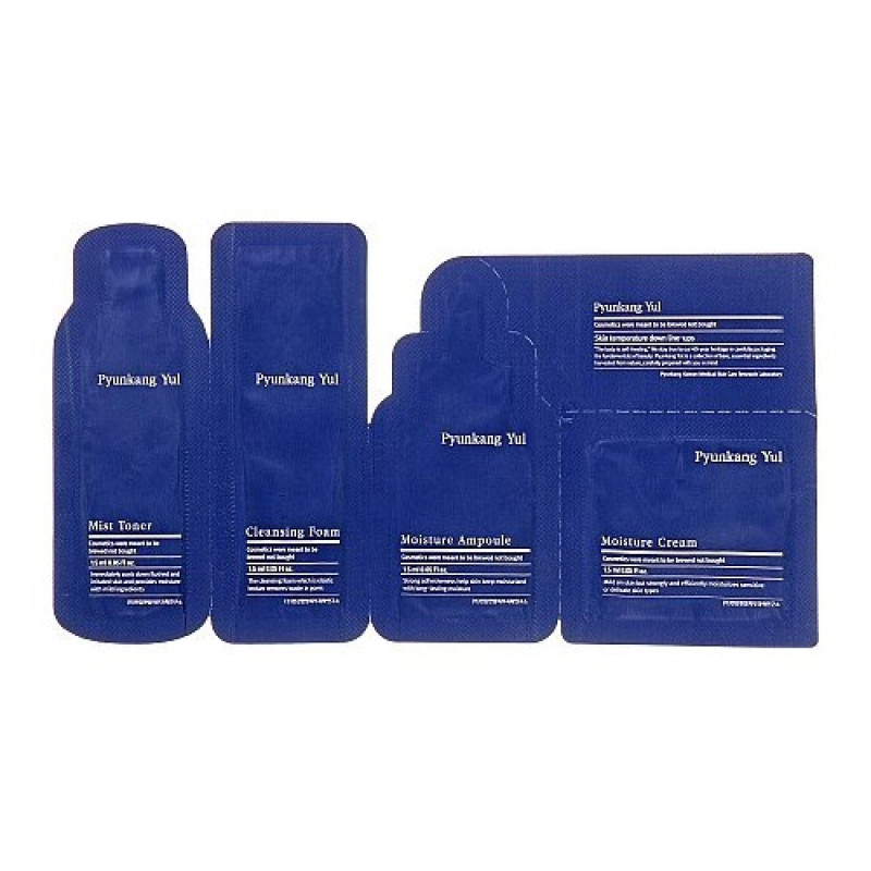 Набір мініатюр Pyunkang Yul Sample містить у собі комплекс професійних доглядових засобів, скуштувавши які один раз, ви вже не зможете зупинитися. До складу набору входить: міст-тонер з екстрактом коптису , для ефективного тонізування, підвищення пружності та еластичності дерми; зволожуюча ампульна сироватка з екстрактом астрагалу , для живлення, зволоження та пом'якшення епідермісу; поживна зволожуюча есенція з бетаїном , для вирівнювання тону та рельєфу шкіри та звуження пір; глибоко зволожуючий крем з маслами ши та жожоба для позбавлення від сухості, лущення та лікування вугрової висипки.