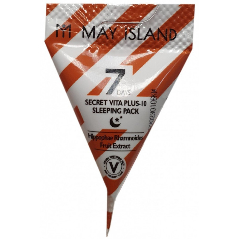 Нічна незмивна маска May Island 7 Days Secret Vita Plus-10 Sleeping Pack призначена для догляду за пересушеною, зневодненою, зів'ялою, потьмянілою шкірою обличчя. Гідратує шкіру, відновлює її, живить, освітлює пігментні плями та запобігає появі нових, нормалізує тон шкіри. Маска відновлює гідробаланс та допомагає утримувати клітинам вологу протягом тривалого часу. Застосування маски дозволяє шкірі виглядати свіжою і відпочилою.