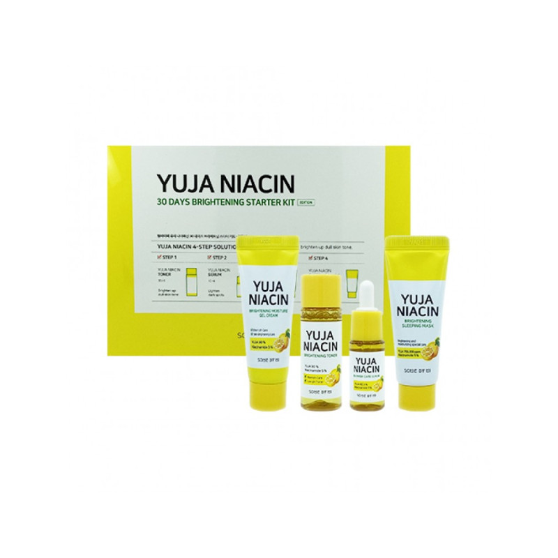 Набір Yuja Niacin 30 Days Brightening Starter kit складається з чотирьох продуктів: тонера, сироватки, крем-гелю та нічної маски. Ці продукти насичують шкіру вітаміном С, мають зміцнюючу, оздоровлюючу та освітлювальну дію.