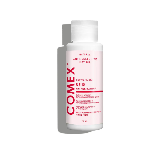 Олія антицелюлітна - ефективний засіб для догляду за шкірою, що допомагає зменшити прояви апельсинової шкірки, попереджає передчасне старіння та в'ялість, а також насичує шкіру корисними компонентами. В складі є екстракт стручкового перцю стимулює розширення судин, покращує мікроциркуляцію крові під шкірою та сприяє спалюванню жирових відкладень та виведенню токсинів. Олія ягід годжі - природний антиоксидант, який прискорює та нормалізує клітинний обмін, забезпечуючи виражений ліфтинг- ефект. Миндальна олія - швидко вбирається, підвищує еластичність та стимулює регенерацію клітин. Олія жожоба - підтримує пружність шкірного покриву та забезпечує глибоке зволоження. Кокосовий екстракт інтенсивно живить, тонізує та зміцнює шкіру. Олія відновлює еластичність, сприяє загоєнню мікропошкоджень та запобігає сухості. Засіб від TM Comex проявляє свої антиоксидантні властивості, які зберігають молодість та здоровий вигляд шкіри.
