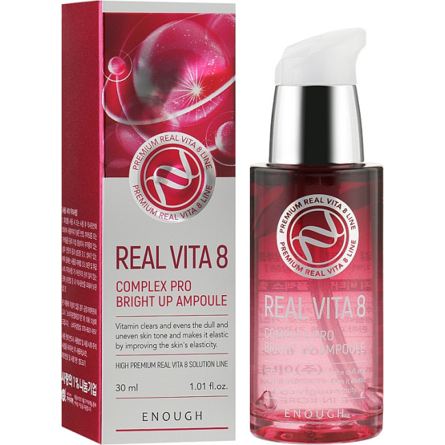 Сироватка для обличчя Enough Real Vita 8 Complex Pro Bright Up Ampoule - вітамінна криниця для Вашої шкіри. Інтенсивно гідратує шкіру, наповнюючи вологою та енергією. Бореться з пігментацією і запобігає появі акне, нових пігментних плям. Знімає роздратування. Омолоджує.