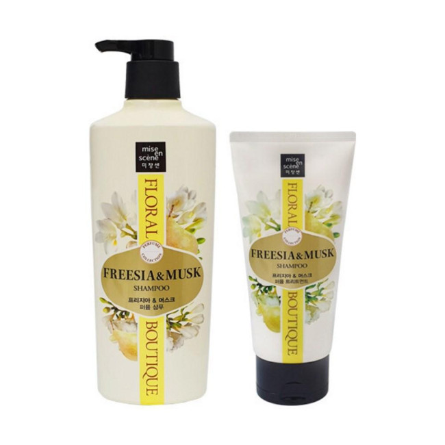 Шампунь Mise-en-scène Floral Boutique Perfume Shampoo Freesia & Musk має приємний квітковий аромат, який триває протягом 24 годин, створюючи атмосферу романтики і елегантності. Склад збагачений цінними рослинними оліями, такі як олія камелії та олія марули, вони забезпечують інтенсивне живлення і відновлення сухого і пошкодженого волосся, додаючи йому природного блиску, шовковистості і еластичності. В формулі оптимальний pH, який розроблений, щоб мінімізувати навантаження, прибрати відчуття липкості і забезпечити відчуття свіжості. Не містить продуктів тваринного походження, мінеральні олії та синтетичні барвники. Шампунь стане дбайливим доглядом за волоссям, котрим можна користуватися кожний день. Засіб від Mise-en-scène підтримує природний блиск волосся, дарує йому шовковистості і слухняності.