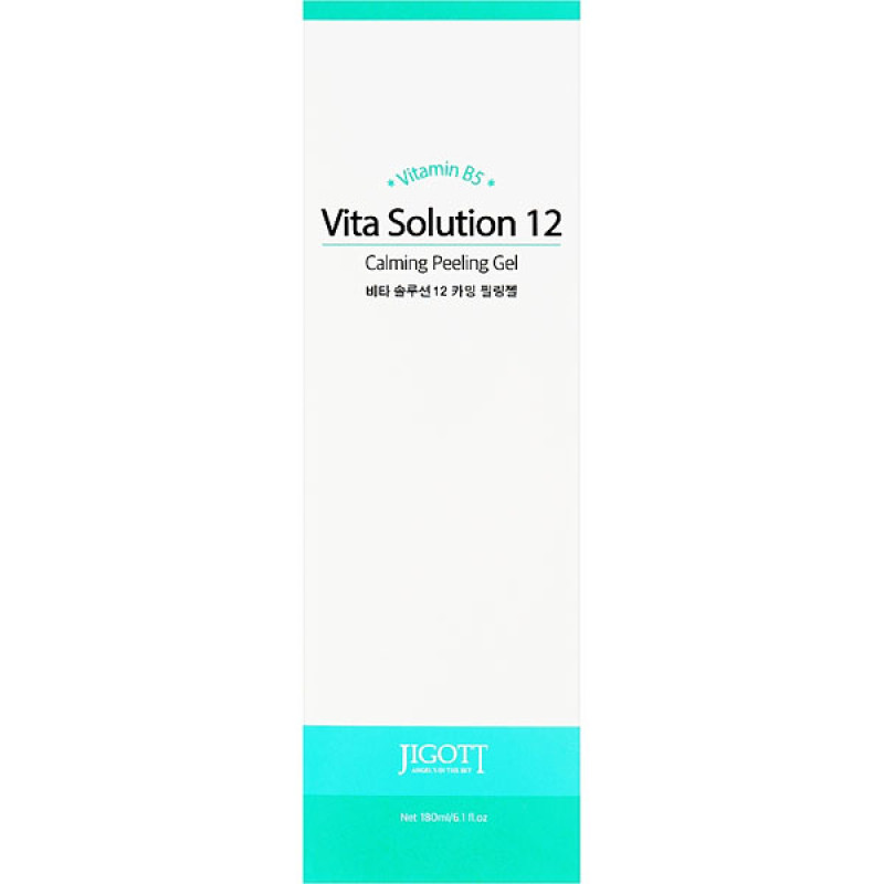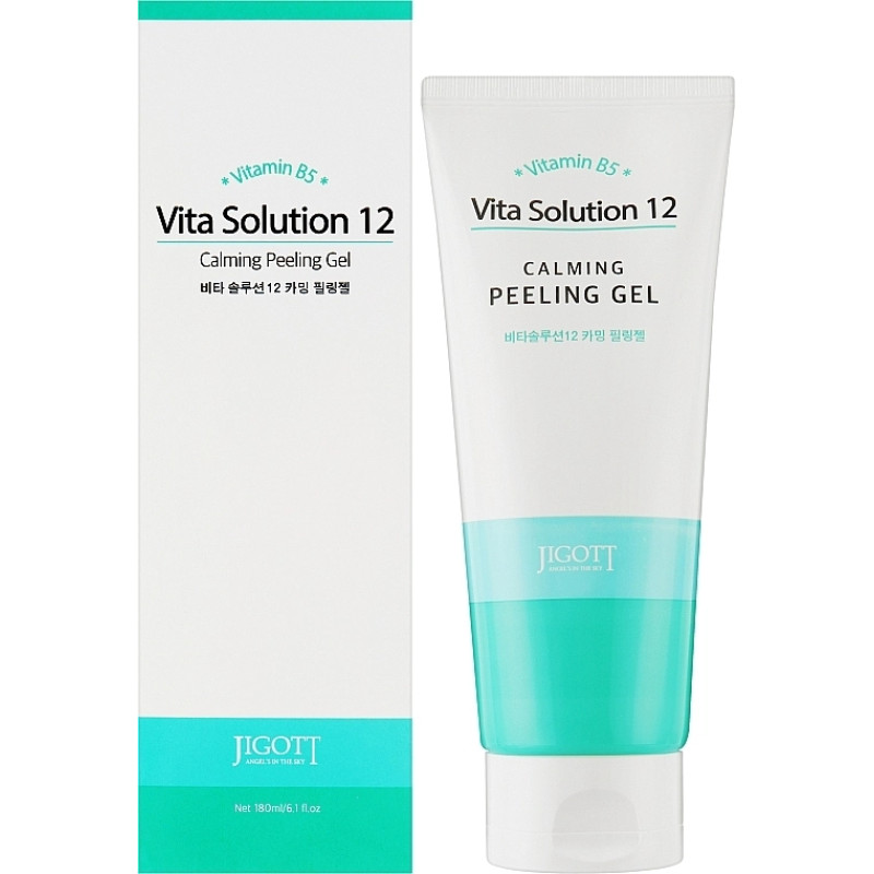 Vita Solution 12 Calming Peeling Gel створений для якісного очищення та делікатного відлущування втомленої та чутливої шкіри. Переваги цього засобу, що дбавливо видаляє ороговілі клітини, сприяючи відновленню шкіри. Ефективно очищує пори від забруднення, запобігаючи їх закупорці, інтенсивно зволожує і живить. В складі є целюлоза, яка нейтралізує надлишки себуму, очищає закупоренні пори і сприяє їх звуженню. Соєві ферменти - заспокоюють і інтенсивно зволожують. Такий засіб від Jigott регулює секрецію шкірного жиру, освіжає та заспокоїть шкіру, продовжує відчуття свіжості і запобігає появлення запалень. Пілінг-гель володіє ефектом м'якого масажу, засіб покращує кровообіг у тканнинах, прискорює загоєння проблемних ділянок та наполнює шкіру вологою.