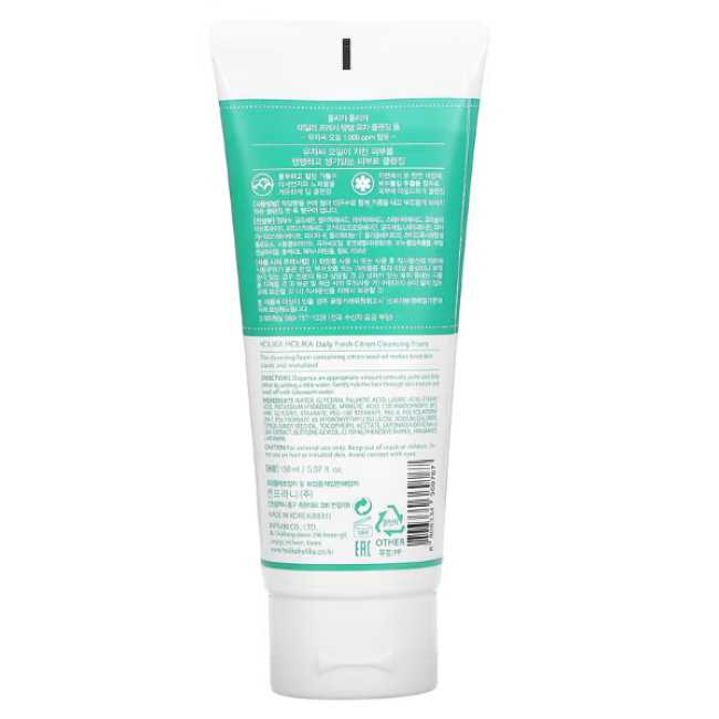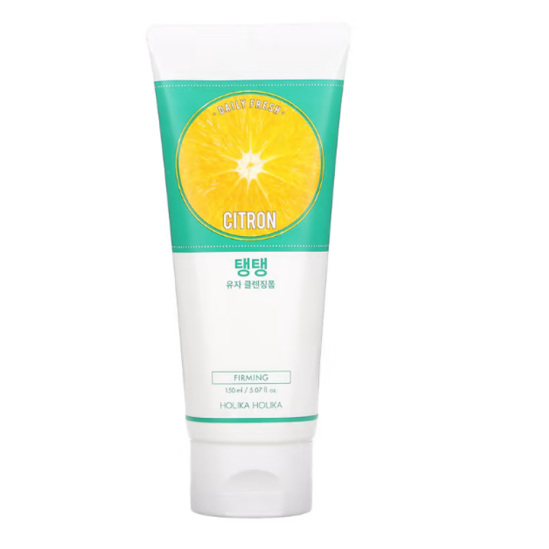 Пінка DAILY FRESH CITRON CLEANSING FOAM - інтенсивно зволожує, освітлює і виводить токсини зі шкіри. В складі є екстракт цитрусів, який оздоровлює епідерміс і сповільнюють процеси старіння. Засіб складається з комплексу жирних кислот, які глибоко зволожують, розгладжують текстуру шкіри, зменшують мімічні зморшки і уповільнюють вікові зміни. Олія насіння юдзу - насичує клітини корисними мікроелементами, при цьому вона делікатно освітлює шкіру, стимулює оновлення клітин, розчиняє забруднення при контакті з водою і виводить токсини. Екстракт мильнянки - проявляє свої очищувальні і антибактеріальні властивості, глибоко проникає в пори, нормалізує роботу сальних залоз, усуває жирний блиск і сприяє кращому проникненню кисню в клітини. Гліцерин - працює над зволоженням шкіри, допомагає позбутися сухості, лущення і відчуття стягнутості. Пінка глибоко очищує, оздоровлює, заспокоює шкіру і запобігає появі висипань.Засіб від Holika Holika це делікатний догляд. який м'яко очищує шкіру і не викликає подразнень.