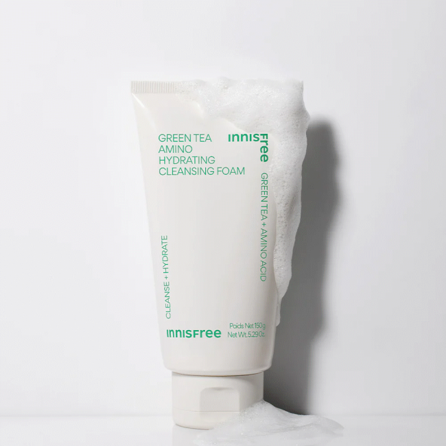 Пінка Green Tea Amino Cleansing Foam - засіб чудово очищує пори шкіри від забруднень, запобігає звуженню пор, зберігає бар'єр шкіри, не пересушує шкіру та запобігає лущенню. В складі є зелений чай - потужний рослинний антиоксидант, який допомагає зберегти молодість, покращує колір обличчя та уповільнює процес старіння. Він зменшує вплив сонячних променів, насичує клітини киснем, зміцнює захисні властивості шкіри. Кофеїн - покращує мікроциркуляцію крові, зменшує набряки і підвищує пружність шкіри. Вітаміни С, К володіють загоювальними властивостями і створюють захисну плівку з бактерицидним ефектом. Екстракт грейпфрута регулює обмін сполук, проявляє протизапальні і протиалергічні властивості. Пінка ніжно очищує від повсякденних забруднень і надає відчуття легкості та свіжості. Засіб від Innisfree не містить парабенів, мінеральну оливу, продукти тваринного походження та ароматизатори.