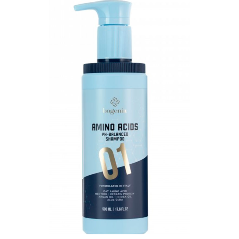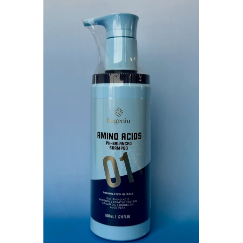 Шампунь Amino Acids Shampoo - засіб з амінокислотами делікатно очищує шкіру голови, не порушуючи її природний pH баланс. Шампунь усуває лущення, дарує волоссю м'якість і природний блиск, а також підтримує оптимальний рівень зволоженості. Засіб активно живить шкіру голови, при контакті з водою утворює активну піну, яка м'яко усуває себум, пил, забруднення і косметичні засоби. Запобігає появі посічених кінчиків і надає шовковистості. В складі є кератин і арганова олія, які надають волоссю природного блиску і легко розплутується. Засіб від Bogenia підходить для чутливої шкіри голови.