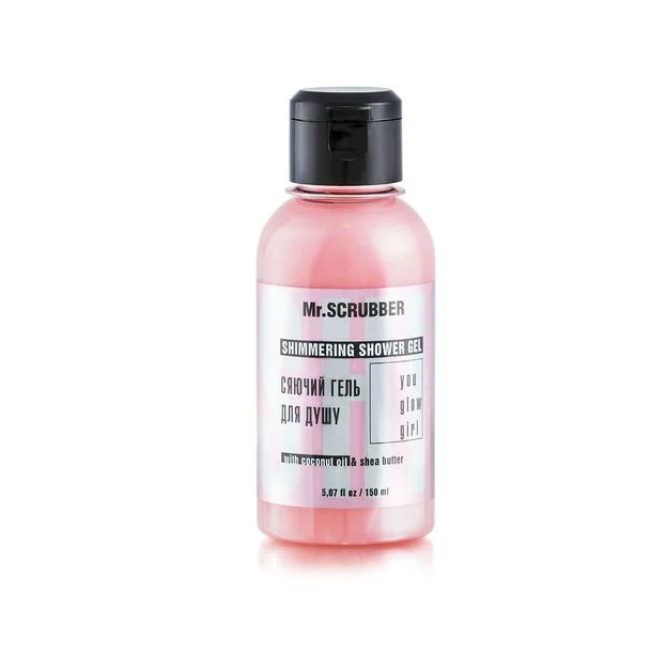 Гель для душу You Glow Girl - подарує шкірі не тільки очищення, а і справжнє сяяння. Засіб дбайливо очищує, зволожує та надає шкірі мерехтливого блиску. Текстура засобу створює ефект доглянутості та сяйва після першого використання. В складі є олія ши - інтенсивно пом'якшує, зволожує та покращує тон шкіри. Має потужну відновлювальну дію, стимулює вироблення колагену та сприяє загоєнню мікротріщин. Кокосова олія - глибоко живить, відновлює природний ліпідний бар'єр, утримує вологу, пом'якшує шкіру, зменшує прояви целюліту та розтяжок. Морська сіль - збагачена мінералами, загоює, захищає, зміцнює шкіру ті підтримує її молодість. Гель усуває подразнення, зменшує алергічні прояви і зберігає природну рівновагу шкіри. Засіб від Mr.Scrubber утворює густу та шовковисту піну, яка чудово змивається водою, при цьому залишаючи дрібний блискучий шиммер.