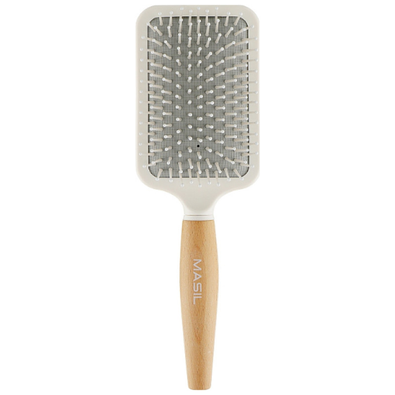 Інноваційна щітка-гребінець для волосся Wooden Paddle Brush якісно розділяє волосяні нитки, запобігає їх сплутуванню, ламкості та випаданню. Ергономічна ручка та комфортні габарити дозволяють не тільки розчесати локони, але виконати масаж голови. Такі маніпуляції зміцнюють фолікули, покращують аерацію, прискорюють мікроциркуляцію крові в епітеліальних тканинах.