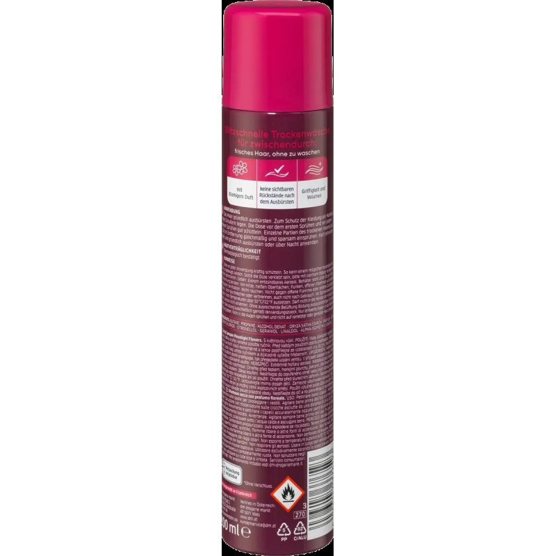 Сухий шампунь Moonlight Flowers Balea Trockenshampoo Moonlight Flowers буде помічником, щоб освіжити голову, коли немає часу її помити. Зачіска буде виглядати бездогано і не буде поганого настрою. Засіб ефективно поглинає надлишки себуму та усуває жирний блиск. Локони виглядають доглянутими і мають об'єм, а також приємний квітковий аромат, який буде супроводжувати вас. Завдяки зручному розпилювачу шампунь легко наноситься, ефективно очищає і поглинає забруднення. Сухий шампунь не склеює волосся і додає об'єму біля коренів, пом'якшує волосся і робить його слухняним і доглянутим. Засіб від Balea має стильну упаковку. яку можна взяти у подорож і вона знадобиться, коли буде мало часу, щоб привести себе в порядок.