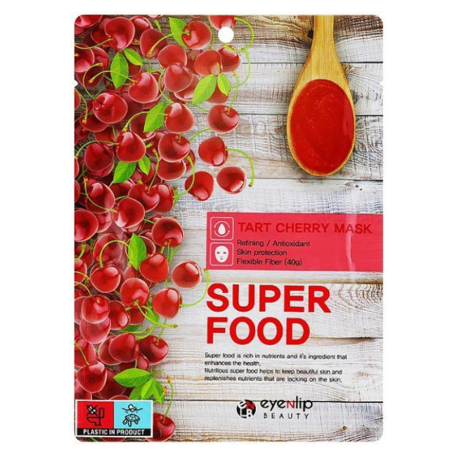 Б'юті-продукт насичений відомим у косметології екстрактом вишні. Він має чудову зміцнювальну дію, покращує пружність шкіри та сприяє розгладженню заломів дерми. Маска має натуральну бавовняну основу і дуже щедро просякнута корисним еліксиром. Також засіб має виражену антиоксидантну властивість.