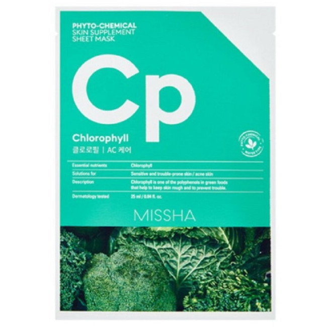 Тканинна маска Missha Phytochemical Skin Supplement Sheet Mask Chlorophyll/AC Care - універсальний зволожуючий, протизапальний засіб для шкіри обличчя. Гіпоалергенна основа тканини щільно прилягає до шкіри, забезпечуючи швидку і глибоку абсорбцію есенції в епідерміс.