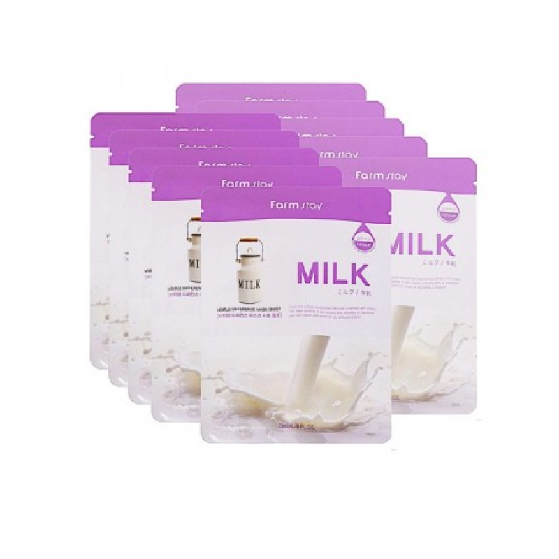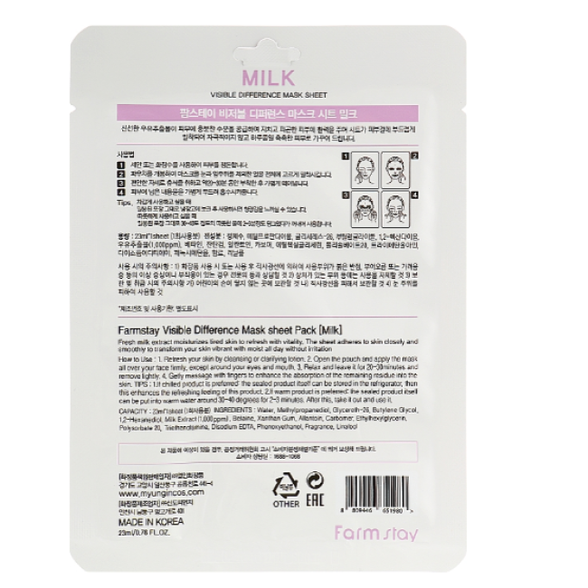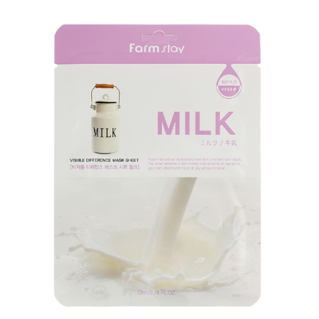 Маска Visible Difference Mask Sheet Milk - вирівнює текстуру шкіри після застосування і створює накопичувальний ефект після постійного користування. Засіб збагачений молочними протеїнами для глибокого живлення, аргініном, гіалуроновою кислотою та бетаїном, які глибоко живлять, зволожують, зміцнюють захисний бар'єр та помітно покращують колір обличчя. Маска робить зморшки менш вираженими, відновлює шкіру після стресу та надає природне сяйво. Маска має ніжну тканинну основу щільно прилягає та повторює контури обличчя. Маска робить покращення пружності та еластичності, освітлює тьмяну шкіру та дарує здорове сяйво. Засіб від FarmStay робить менш помітним зморшки та лінії, забезпечує антиоксидантний захист.