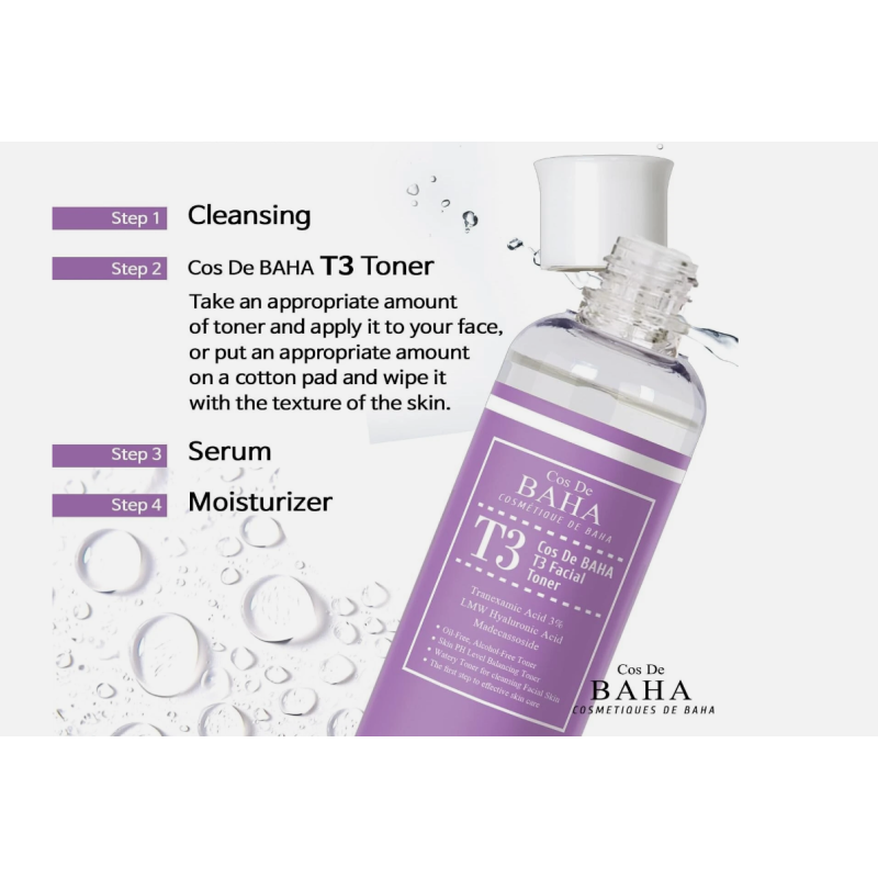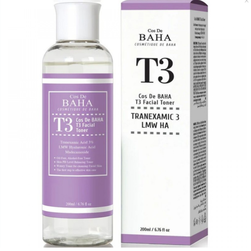 Тонер T3 Facial Toner 200ml - багатофункціональний засіб, що м'яко вирівнює тон шкіри, зменшує пігментацію та забезпечує тривале зволоження. Формула з активними компонентами допомагає повернути шкірі свіжий, сяючий вигляд та зробити її більш пружною. В складі є 3% транексамової кислоти, яка освітлює пігментацію, постакне, вирівнює тон і мікрорельєф шкіри, зволожує та заспокоює. Гіалуронова кислота - забезпечують глибоке зволоження, зберігають вологу в клітинах. Стабільна формула Вітаміну С - надає сяйва, бореться з тьмяністю, підтримує багатобар'єрну функцію. Тонер працює над освіженням і підтримкою балансу шкіри, не перезавантажує жирну та чутливу шкіру. Засіб від COSDEBAHA надає шкірі сяйва, бореться з тьмяністю, підтримує бар'єрну функцію.