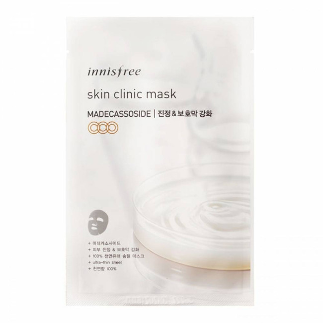 Innisfree Skin Clinic Mask Madecassosid допоможе створити додатковий догляд для чутливої, подразненої та сухої шкіри. Основа маски дуже тонка, що дихає, завдяки цьому клітини насичуються киснем, а корисні мікроелементи проникають глибоко в пори і не випаровуються в повітря.