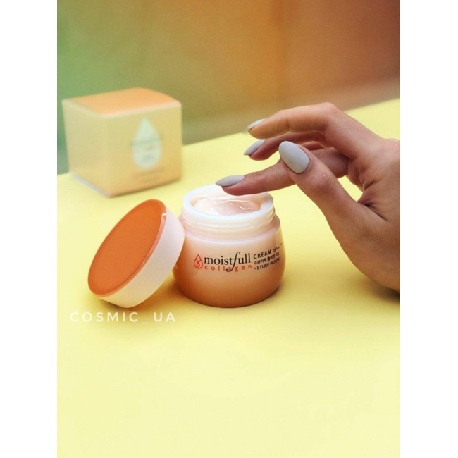 Крем Moistfull Collagen Cream незамінний засіб для щоденного догляду за шкірою, має невагому текстуру, яка миттєво вбирається, не залишає жирних і липких слідів. Він чудово зволожує та живить шкіру, повертає їй здоровий, доглянутий, сяючий вигляд. До складу продукту входить морський колаген , який максимально близький до того, що знаходиться в організмі людини. Він проникає в дерму, відновлює колагенові волокна, стимулює вироблення еластину, підтягує шкіру, робить її більш пружною. Гліцерин – дбайливо пом'якшує, позбавляє від надмірної сухості та лущення, пов'язує молокули води та затримує її у клітинах. Стеаринова кислота – ефективно очищає, позбавляє таких недоліків як: прищі, вугри, камедони, чорні крапки, звужує пори, вирівнює рельєф. Каолін - має протизапальну та антимікробну дію, вбиває шкідливі організми і не дозволяє їм проникати в шкіру. Бетаїн – загоює пошкоджені тканини, глибоко зволожує, нормалізує клітинне дихання. Екстракт баобаба – зміцнює шкірний покрив, покращує його захисні здібності, покращує мікроциркуляцію у капілярах, знижує кількість вільних радикалів.