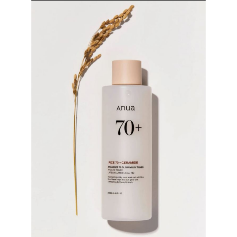 Тонер Rice 70 Glow Milky Toner - освітлювальний і зволожувальний, який забезпечує ефект зволоженого і чистого обличчя. В складі є гідролат рису - багатий на антиоксиданти, вітаміни групи В і E, зволожує, заспокоює та покращує пружність шкіри. Ніацинамід - бореться з запаленнями, регулює жирність і освітлює пігментацію. Пантенол - заспокоює, знімає подразнення і сприяє відновленню мікротріщин. Цераміди - зміцнюють захисний бар'єр і запобігає втраті вологи. гіалуронова кислота - глибоко зволожує, надає пружності і підтримує водний баланс. Тонер забезпечує інтенсивне зволоження, живлення, освітлення тону шкіри, відновлення, регенерацію, заспокоює подразнення, покращення загального вигляду і текстури шкіри. Засіб від Anua насичує клітини шкірного покриву необхідними мікроелементами.
