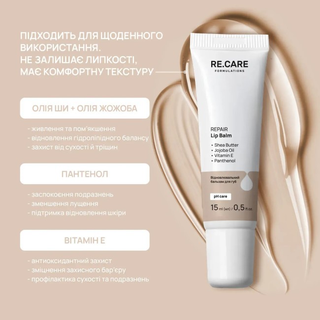Восстанавливающий бальзам для губ Repair Lip Balm Re.Care дарит глубокое питание, комфорт и длительную защиту в любое время года. Его текстура мягкая, пластичная, легко ложится на кожу и создает тонкую, защитную вуаль, которая сохраняет влагу и придает естественный блеск.