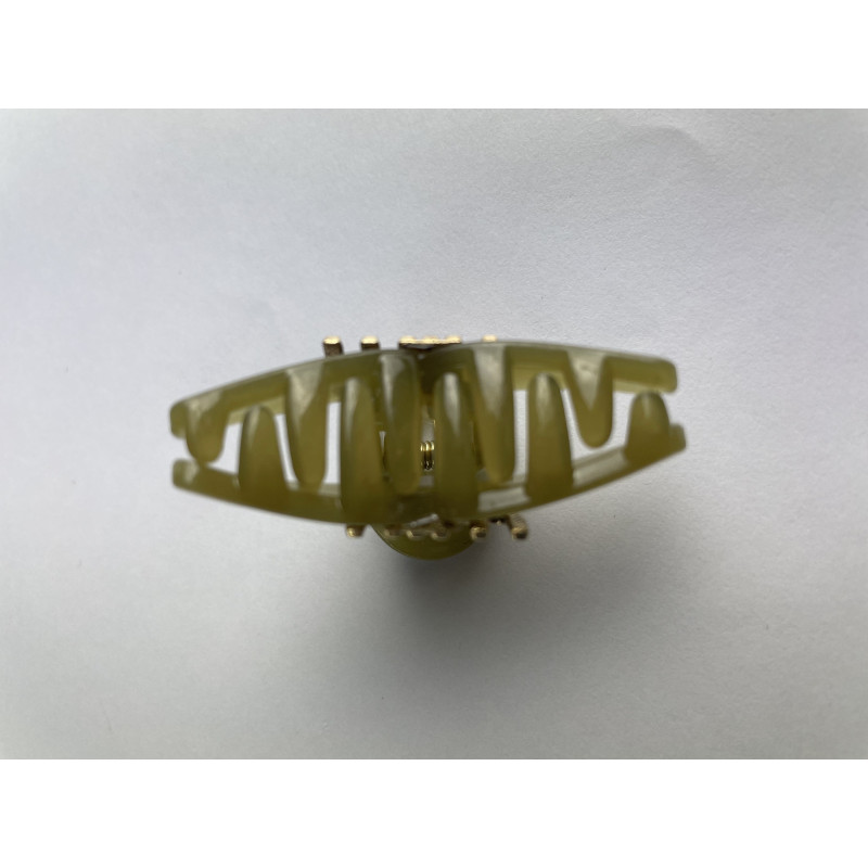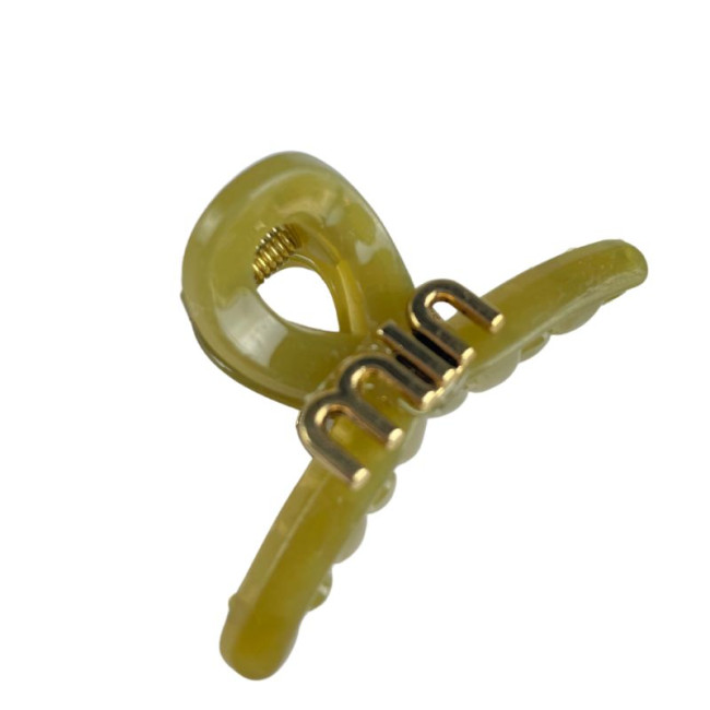 Изготовлен из качественного ацетата насыщенного оливково-зеленого оттенка с благородным мраморным переливом, эта заколка размером 4.5 см гармонично сочетает в себе практичность и эстетику. Фирменный золотистый логотип MIU MIU придает изделию изысканность, а прочный металлический механизм гарантирует надежное держание.
