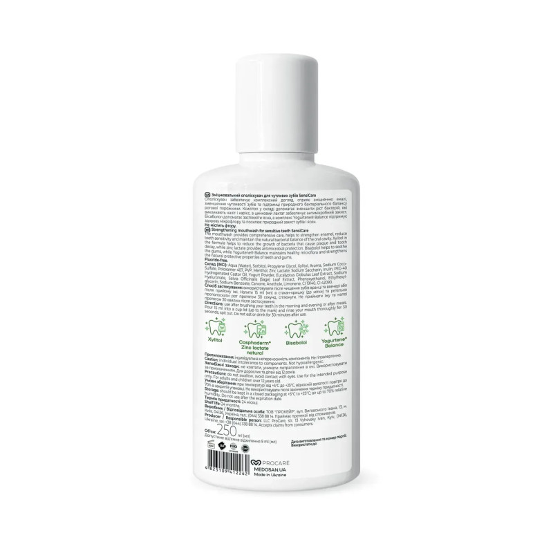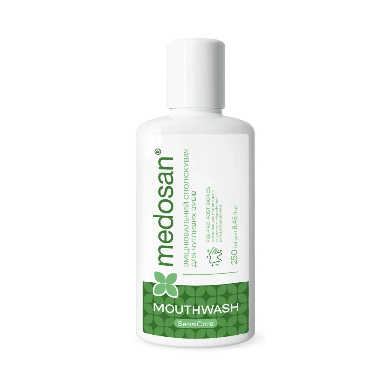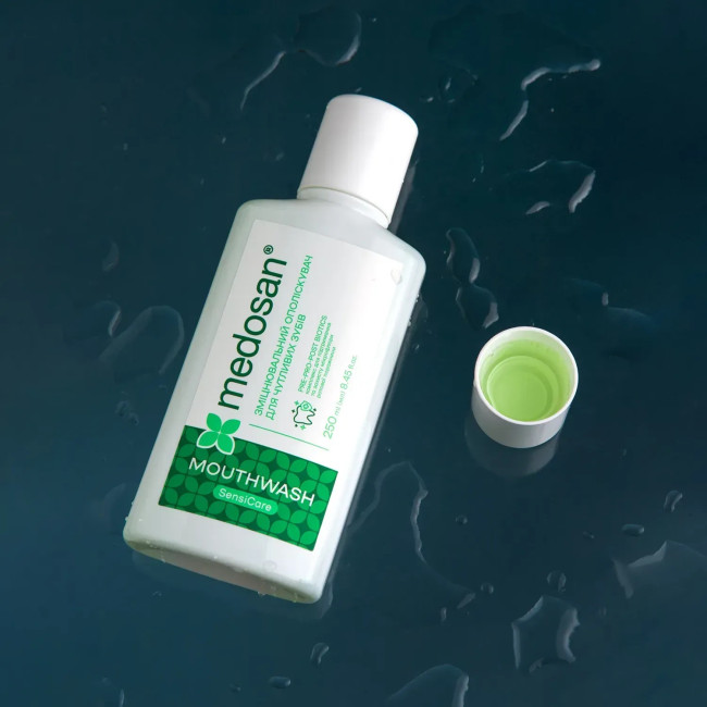 Укрепляющий ополаскиватель для чувствительных зубов SensiCare Medosan ежедневный уход, сочетающий мягкое действие, мощное защитное укрепление и длительную свежесть. Увлажняющая база на основе сорбита и пропандиола помогает равномерно распределять активные компоненты, создавая комфортное чувство без пересушивания слизистой. Ксилитол дополнительно поддерживает естественный баланс микрофлоры и помогает снизить риск появления кариеса.