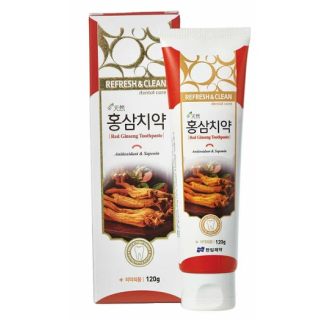 Зубная паста REFRESH & CLEAN RED Ginseng Toothpaste - мягко и эффективно удаляет зубной налет, остатки пищи и неприятный запах, оставляя ощущение свежести надолго. Паста имеет приятный вкус, бережно очищает зубную эмаль и при постоянном использовании улучшает состояние десен. В составе есть красный женьшень - питает десны витаминами, способствует укреплению зубов, уменьшает кровоточивость и обладает мягким противовоспалительным и антибактериальным действием. Паста демонстрирует комплексный уход, это укрепление, защита, питание и восстановление чистоты зубов. Средство от Hanil при регулярном использовании помогает предотвратить развитие кариеса и пародонтоза, при этом поддерживая здоровье полости рта.