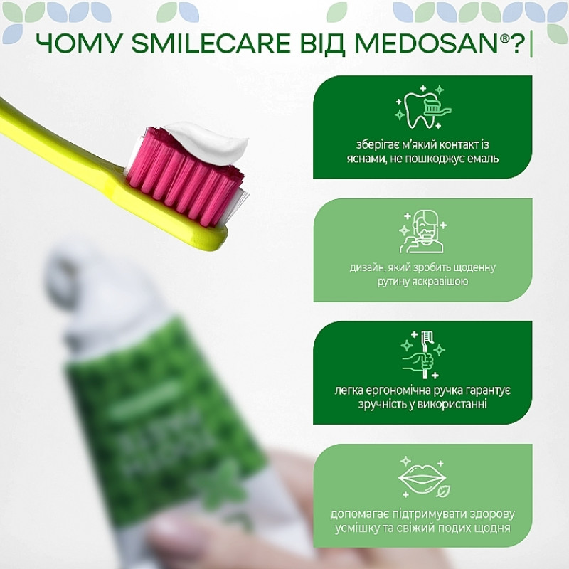 Зубная щетка SmileCare Medium Green Medosan для тех, кто ценит сочетание эффективности, комфорта и аккуратного ухода за улыбкой. Ее средняя жесткость является универсальным вариантом для ежедневной очистки: щетинки достаточно упругие, чтобы тщательно устранять налет, но в то же время деликатные к деснам, не создают раздражения и подходят для большинства типов зубов.